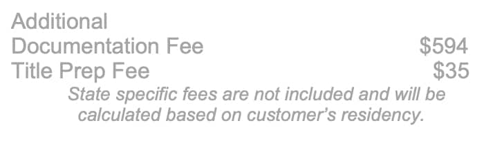 * Massachusetts stores: Price Listed does not include $594 documentation fee and a $5 title fee, Applicable Tax, Title, Tags, Processing, License. New York store: Price listed does not include $175 Documentation Fee, Applicable Tax, Title, Tags, Processing, License, and any other dealer-installed options.*
